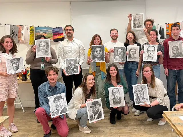 🎭 Atelier portrait au fusain – Dans nos ateliers, les participants ont exploré le dessin au fusain à travers un cours de portrait. Accompagnés par nos artistes professionnels, ils ont découvert les bases du trait, des ombres et de la construction d’un visage.